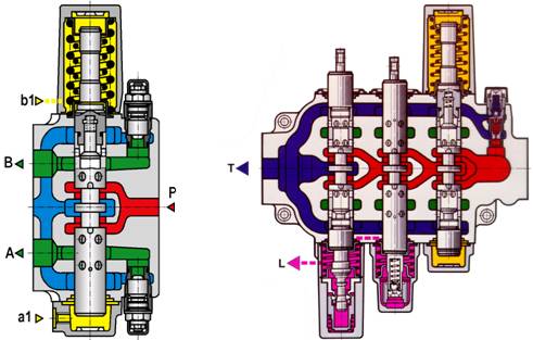 在閥桿中位,油液通過鑄造的通道無壓的從P口流到T口(中位循環(huán)),泵和執(zhí)行機構(gòu)工作油路的接口A和B連接切斷。可利用機械式的手柄或依靠液壓方式在a1或b1口引入先導(dǎo)壓力,使閥桿離開中位而移動。