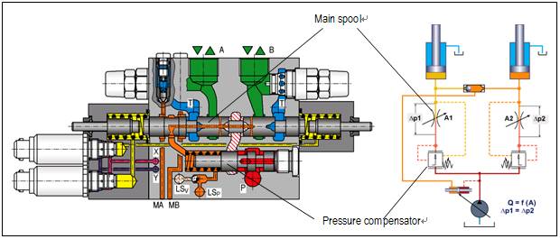 壓力補償閥用一個給定的壓力差作為檢測變量,主閥芯的壓力上下波動被檢測,并且控制壓力補償閥的閥桿。