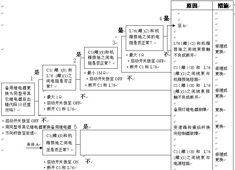 1)變速箱和操縱桿控制器C1(雌)(10)和機(jī)箱接地之間的電阻:5-15Ω