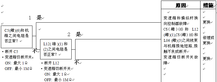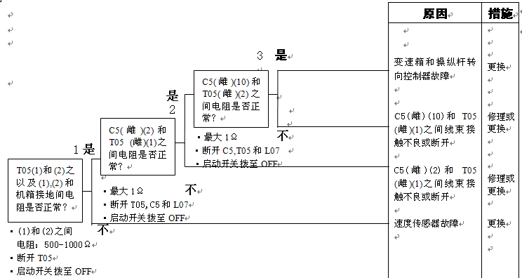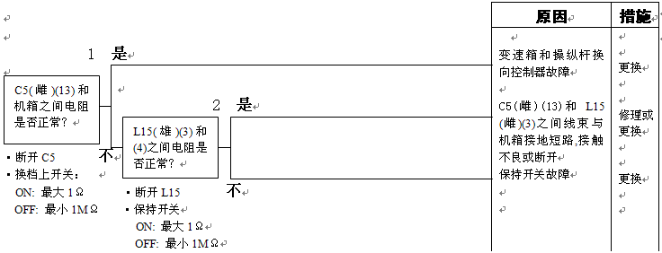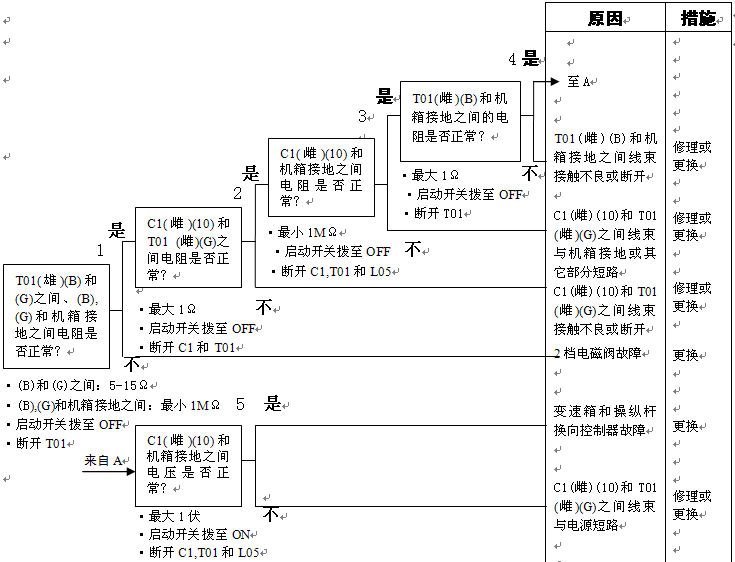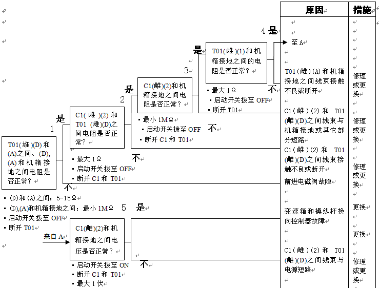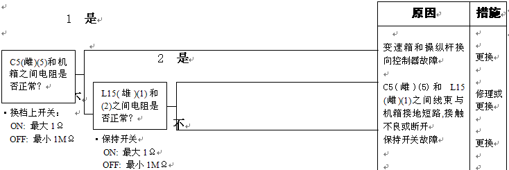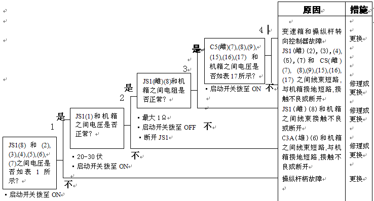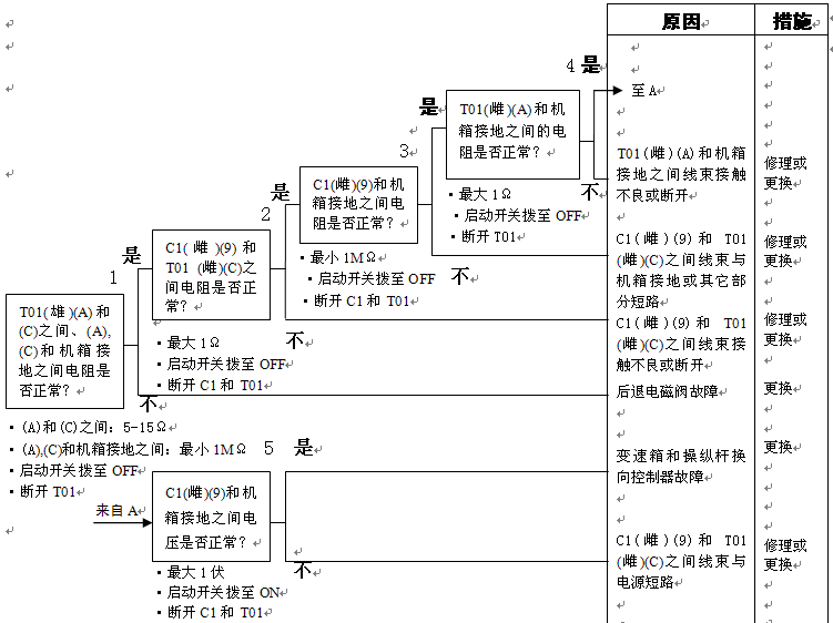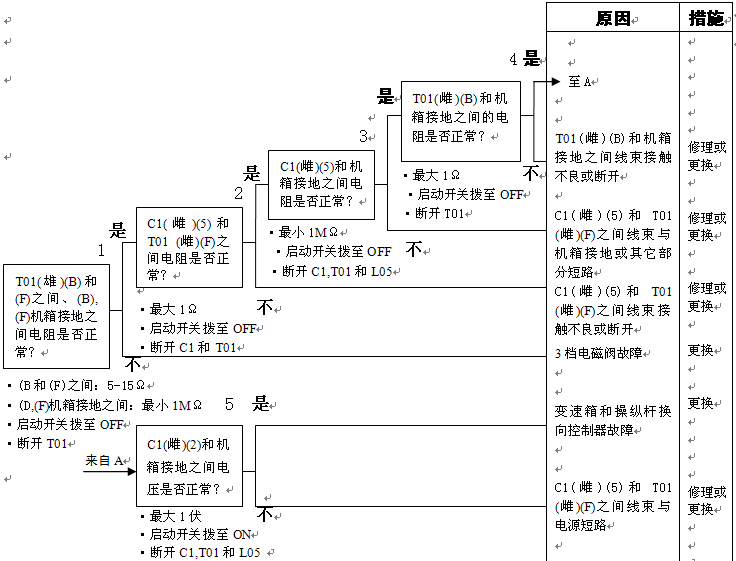 1)變速箱和操縱桿控制器C1(雌)(5)和機(jī)箱接地之間的電阻:5-15Ω