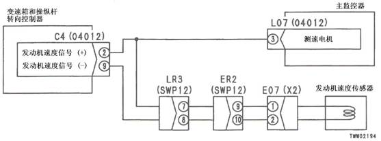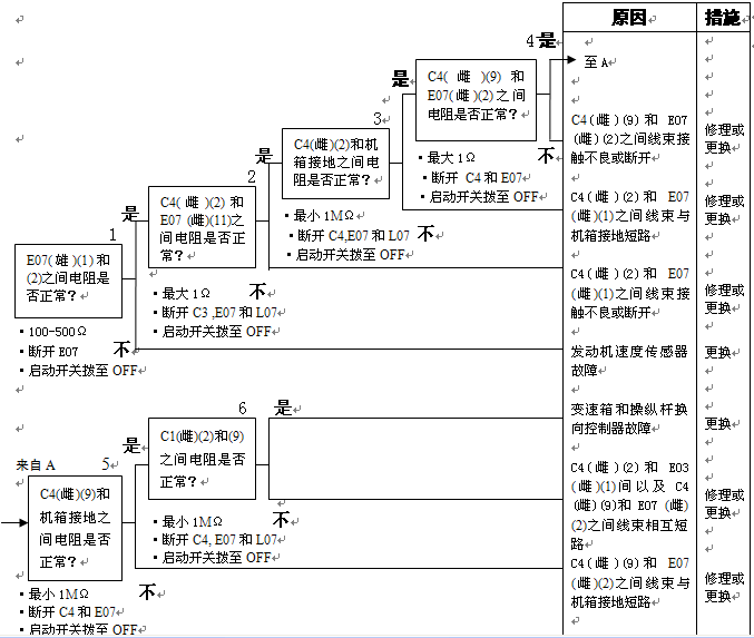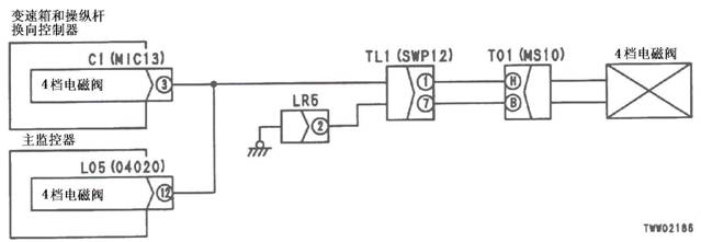 3)變速箱和操縱桿控制器C4(雌)(2)-LR3(7)-ER2(9)-E07(1)之間線束觸點(diǎn)有故障或斷開(kāi)