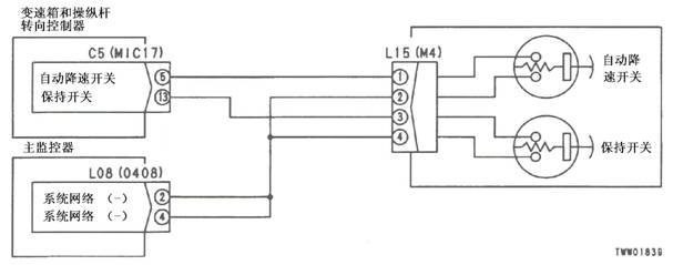 2)變速箱和操縱桿控制器C1(雌)-TL1(4)-T01(E)之間線束與電源短路,與機(jī)箱接地短路,觸點(diǎn)有故障或斷開(kāi)