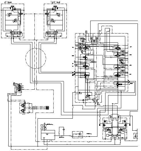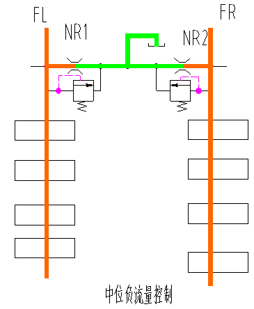 當閥處于中位時,P1,P2通過閥的中位油道,最后經過NR1,NR2節流后回油箱,在節流口NR1,NR2前取得壓力信號FL,FR,就可以控制主泵到最小排量。