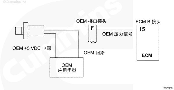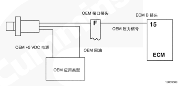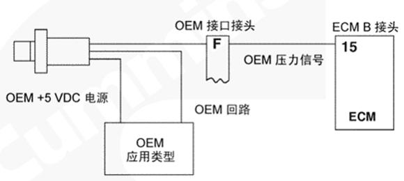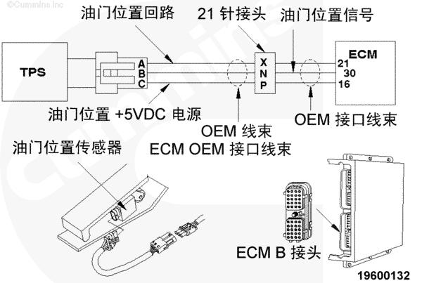 油門踏板通過 OEM 線束和 OEM 接口線束向 CM500 ECM 提供駕駛員油門指令。CM500 ECM 利用此信號來確定燃油油軌執行器閥的供油指令。