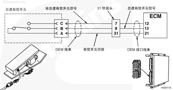 怠速有效信號在 CM500 ECM 檢測到不正確的有效信號時禁用油門控制,這是一個安全特性。怠速有效開關通過 OEM 線束和 OEM 接口線束向 CM500 ECM 提供怠速和非怠速有效信號。