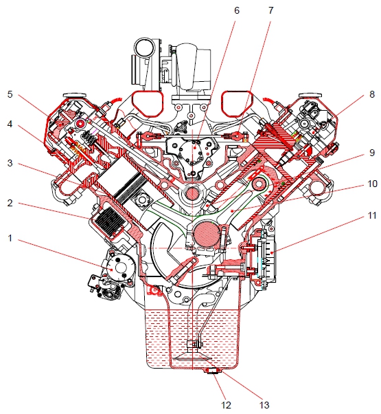 2 機(jī)油冷卻器 9 機(jī)油噴嘴