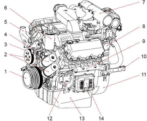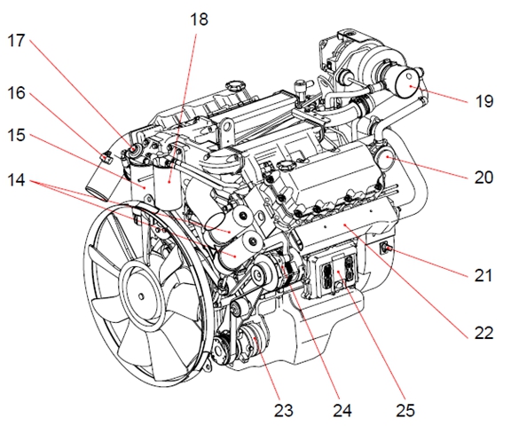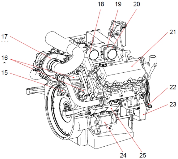 1 曲軸皮帶輪 2 機(jī)油濾清器 3 冷卻水泵皮帶輪 4 惰輪 5 冷卻水出口 6 燃油濾清器 7 空氣管 8 呼吸器 9 排氣歧管 10 安裝支架(后) (渦輪增壓器到中冷器) 11 飛輪殼 12 安裝支架(前) 13 油底殼 14 電氣控制裝置(ECU) 15 動(dòng)力轉(zhuǎn)向泵 16 空氣壓縮機(jī) 17 渦輪增壓器 18 空氣管 19 空氣加熱器(空氣濾清器到渦輪增壓器) 20 空氣管 21 氣缸蓋罩 22 加油口蓋 23 冷卻水入口 24 起動(dòng)機(jī) 25 機(jī)油冷卻器
