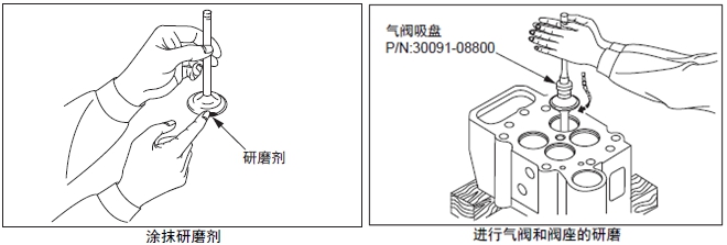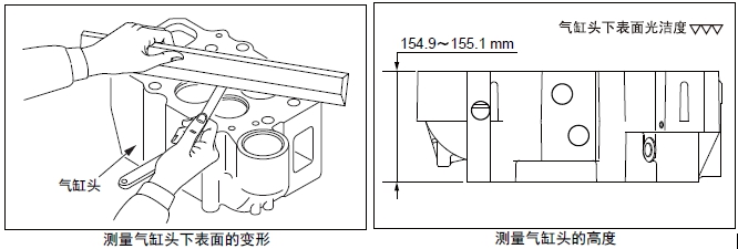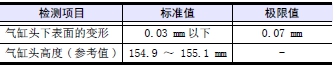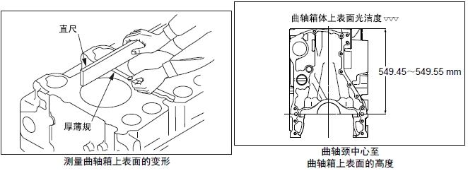 在曲軸箱的上表面放置直尺,用厚薄規(guī)測量變形量。超過極限值時(shí),更換新品或研磨修整。進(jìn)行研磨修整時(shí),要記錄最大研磨量。另外,氣缸頭下面進(jìn)行研磨修整時(shí),合計(jì)的最大研磨量限定在0.50 mm以內(nèi)。