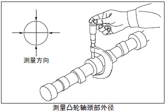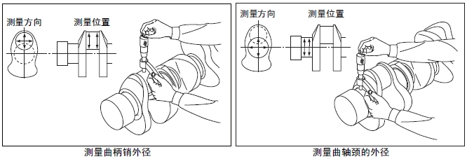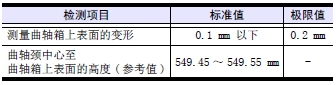 (1) 測量曲軸的曲柄銷和曲軸頸的外徑。超過極限值時(shí),使用減小尺寸的軸瓦,按照和減小尺寸軸瓦的規(guī)格研磨曲軸。使用-1.00 mm 規(guī)格的減小尺寸主軸瓦仍然超出極限值時(shí),更換新的曲軸。