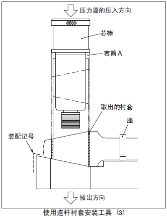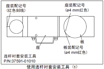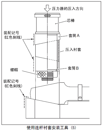 (2) 套筒A裝入心軸,套筒A的裝配記號(紅色刻線)對準(zhǔn)座臺(tái)的裝配記號(紅色刻線)后安裝在連桿襯套內(nèi)。