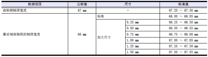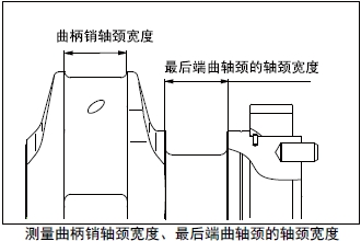 (2) 測量曲柄銷和最后端曲軸頸的軸頸寬度。根據(jù)最后端曲軸頸的軸頸寬度的磨損程度使用加大尺寸推力片時(shí),按照加大尺寸推力片的規(guī)格研磨曲軸。