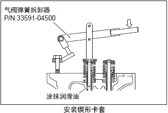 (5) 在氣閥導管上安裝彈簧座、氣閥彈簧和轉動端蓋,用氣閥彈簧拆卸器安裝氣閥的鍥形卡套。