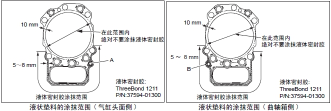 (2) 在氣缸頭墊片兩面的套筒孔和潤滑油通路周圍薄薄涂抹液狀墊料。液狀墊料的涂抹范圍,在氣缸頭墊片外周的5 ~ 8 mm,厚度0.2 ~ 0.5 mm。詳細涂抹范圍參考右圖。