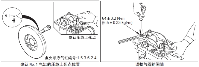 注: 這時,如果No.1 氣缸的進排氣氣閥間隙都為規定值的話,氣閥沒有被壓下。如果在排氣上死點附近時,氣閥被壓下。