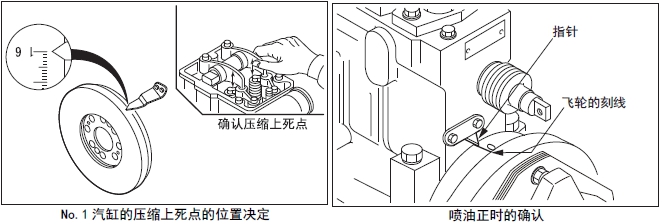(1) 正方向盤轉曲軸,在No.1 氣缸的規定噴油正時的10° 前位置一旦停止。這時,確認燃油噴油泵飛輪的「0」刻線處在指針的附近。