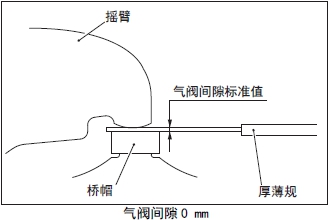 (2) 在搖臂和橋帽之間插入和氣閥間隙標準值相同厚度的厚薄規。( 氣閥間隙0 mm)