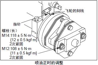 (4) 再次緩慢地正向盤車,使減振器上的規定噴油正時刻線和發動機的指針一致。這時,確認燃油噴油泵飛輪的記號「0」刻線和指針一致。不一致時,反復實施(2) 項。