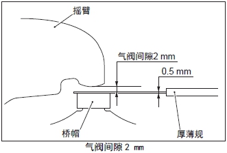 (1) 將0.5 mm的厚薄規插入在橋帽和搖臂之間。(氣閥間隙2 mm)