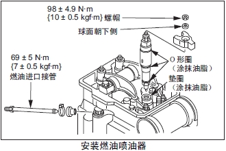 (3) 墊圈上涂抹少量油脂,安裝在燃油噴油器本體上。
