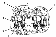 在電子單體噴油器 (2) 上作識(shí)別標(biāo)記以便于安裝。必須把每個(gè)電子控制單體噴油器安裝回缸蓋中的原來(lái)位置。
