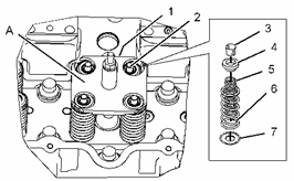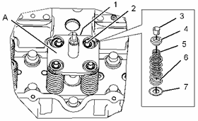 用工具 (A) 壓縮進氣門彈簧 (5) 和排氣門彈簧 (6) 。 在氣門 (2) 上安裝氣門彈簧卡座 (3) 。 拆下單體噴油器擋圈 (1) 和工具 (A) 。