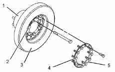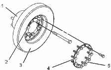 卸下螺栓 (4) 。拆下隔套 (5) 。 從曲軸皮帶輪 (1) 上卸下減振器 (3) 。 減振器 (3) 的重量約為 34 kg (75 lb)。