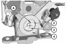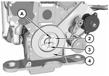 將工具 (A) 安裝在曲軸中。將減振器 (4) 安置在工具 (A) 上。 減振器 (3) 的重量約為 14 kg (30 lb)。