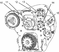 注: 如果卸下軸組件,跳過步驟 12。 需要重新調(diào)整凸輪軸齒輪和可調(diào)惰輪的齒隙。 請參閱測試與調(diào)整, "齒輪總成(前)- 正時"。
