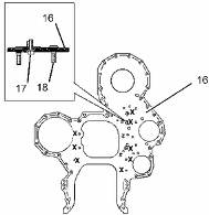 將板 (16) 安裝在缸體的定位銷上。安裝新鎖緊螺栓 (17) (標有 "X")以將前板固定在缸體上。擰緊鎖緊螺栓至扭矩為 55 N·m (41 lb ft)。
