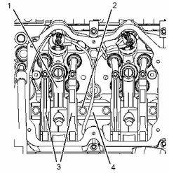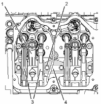 安裝螺栓 (2) ,并擰緊至扭矩為 55 ± 5 N·m (41 ± 4 lb ft)。重新擰緊螺栓 (2) 至扭矩為 55 ± 5 N·m (41 ± 4 lb ft)。 再將螺栓 (2) 轉動 60 ± 5 度。 按照以下順序擰緊凸輪軸螺栓:2、3、1、4。