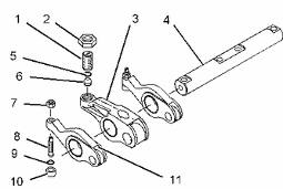 將調整螺釘 (8) 安裝到氣門搖臂 (11) 上。 把防松螺母 (7) 安裝到調整螺釘上。