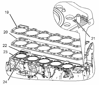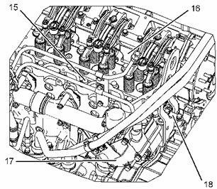 將適當的起吊設備接連在缸蓋 (16) 上。 缸蓋的重量約為 235 kg (518 lb)。