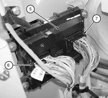卡特彼勒365C和385C挖掘機機器 ECM (5) 位于駕駛室(前檢修門) (1) 后面的腔室內。