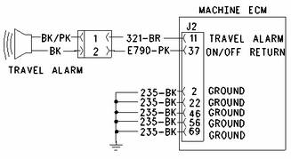 該診斷代碼與行駛警報(bào)器有關(guān)。 FMI 05 意味著 ECM 已確定警報(bào)器的電流低于正常值。