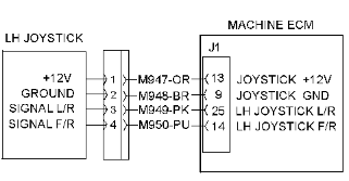 將萬用表表筆引線插入左手操縱手柄控制傳感器接頭的背面,并測量觸點(diǎn) 1(M947-OR)和觸點(diǎn) 2(M948-BR)間的電壓。