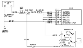 當鑰匙開關處于接通位置或起動位置時,ECM 通過 P1-70 接收鑰匙開關的輸入。 當 ECM 檢測到此輸入處有蓄電池電壓時,ECM 就會通電啟動。 當斷開此輸入的蓄電池電壓時,ECM 就會斷電停機。
