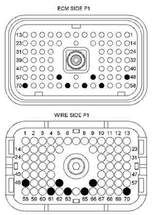ECM 通過 ECM 的 15 安培保險絲持續接收蓄電池電壓。 無開關蓄電池電壓通過 P1-48 、P1-52 和 P1-53 供至 ECM。 蓄電池負極通過 P1-61、P1-63 和 P1-65 供至 ECM。