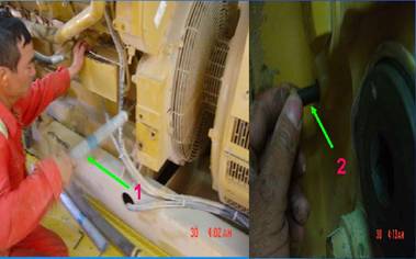 并按柴油機正常轉向將飛輪1轉動360°將定正時螺栓2擰入氣輪時,確定1號活塞位于是否壓縮沖程,還是排氣沖程式上死點。