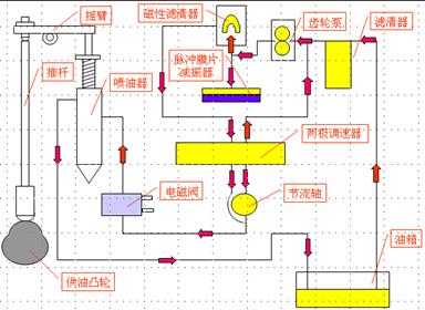 PT燃油系統的基本結構形式:它由油箱、燃油濾清器、PT燃油泵、低壓輸油管、噴油器、搖臂、推桿、噴油凸輪和回油管等組成。其中:PT燃油泵又包括:齒輪泵、磁性濾清器、脈沖膜片減振器、兩極調速器、 節流軸、電磁閥等。