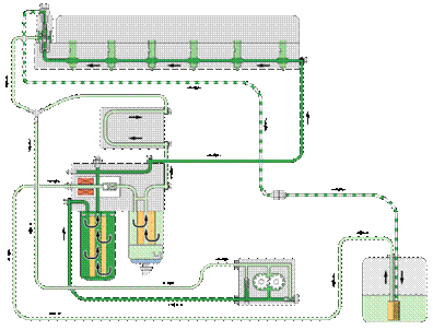 VOLVO PENTA系列柴油機(jī)的燃油系統(tǒng)為電噴,其包括供應(yīng)和噴射兩個(gè)系統(tǒng)。供應(yīng)油路由粗濾器(有油水分離功能)、ECU泠卻管路、隨動輸油泵、手動輸油泵、精濾器、缸頭總油道組成。噴射系統(tǒng)由噴油凸輪、油頭泵組、電磁閥組成。因?yàn)闅怏w的可壓縮性,如果在高壓油路中混入空氣則會產(chǎn)生氣阻,從而導(dǎo)致噴油不正常以至于造成工作轉(zhuǎn)速不穩(wěn)定,影響柴油機(jī)的使用壽命。故在每次起動之前必須壓動手動輸油泵至壓不動為止,以確保排盡高壓油路中的空氣。VOLVO PENTA系列柴油機(jī)燃油系統(tǒng)組件中精密是油頭泵組,特別是燃油噴嘴,如果燃油中有水會導(dǎo)致噴嘴銹蝕導(dǎo)致油嘴損壞,故在燃油系統(tǒng)中安裝有油水分離功能的粗濾器。在機(jī)器使用一段時(shí)間后要檢查粗濾器下部的油杯內(nèi)是否有水,若有應(yīng)及時(shí)排除,以保證燃油系統(tǒng)的正常工作。VOLVO PENTA系列柴油機(jī)的柴油精濾器正常使用為400小時(shí),視柴油質(zhì)量可適當(dāng)提前。