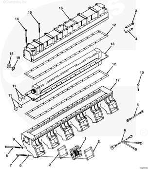 在工業用 康明斯發動機上,格柵加熱器安裝在中冷器殼體和缸蓋之間。格柵加熱器提供暖空氣,從而控制發動機冷起動時的白煙。格柵加熱器的信息在本資料的第 13 節提供。不帶格柵加熱器的發動機在中冷器殼體和缸蓋之間有一個隔套。