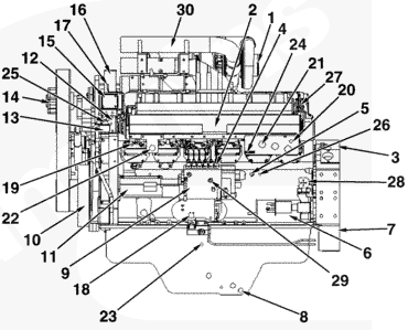 1渦輪增壓器進口接頭,2中冷器殼/進氣歧管,3發動機轉速傳感器,4高壓供油管,5機油壓力傳感器,6起動馬達,7飛輪殼,8放油口,9左排燃油泵,10減振器,11燃油泵驅動殼,12冷卻液溫度傳感器,13曲軸箱通風裝置,14風扇輪轂,15節溫器殼,16冷卻液出口接頭,17冷卻液排氣管,18燃油切斷閥 1(左排),19進氣歧管壓力傳感器 1(左排),20進氣歧管溫度傳感器 1(左排),21 INLINE 接頭,22數據通信接頭,23機油油位傳感器(選裝),24大氣壓力傳感器,25冷卻液壓力傳感器,26機油溫度傳感器,27加熱器接頭,28起動馬達電磁閥,29溢流閥,30 ATA 跨接接頭。