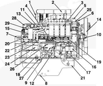 1渦輪增壓器進口接頭,2 ATA 跨接接頭,3組合式機油濾清器,4高壓燃油管,5冷卻液出口接頭,6吊耳,7飛輪殼,8放油口,9右排燃油泵,10風扇皮帶惰輪總成,11燃油進口管接頭,12加油管,13燃油供應泵殼,14風扇輪轂,15燃油濾清器,16冷卻液添加劑,17冷卻液泵,18燃油切斷閥 2(右排),19進氣歧管壓力傳感器 2(右排),20進氣歧管溫度傳感器 2(右排),21冷卻液進口接頭,22機油輸送管,23 Centinel 驅動器接頭,24 Centinel 油箱油位開關接頭,25充電機,26溢流閥,27燃油出口管接頭,28供油壓力傳感器,29供油溫度傳感器,