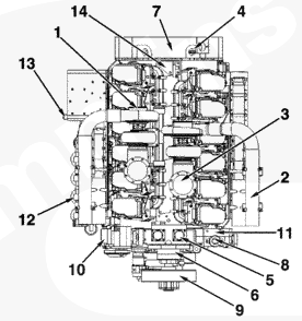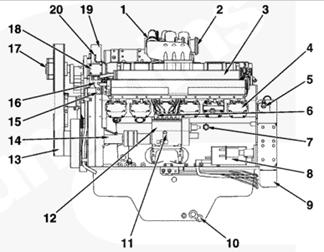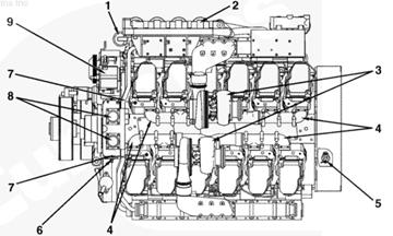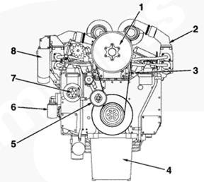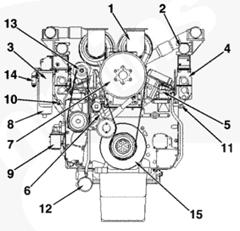 1渦輪增壓器進口接頭,2 ATA 跨接接頭,3排氣口接頭,4發動機轉速傳感器,5冷卻液出口接頭,6前吊耳,7飛輪殼,8曲軸箱通風裝置,9風扇輪轂,10充電機,11冷卻液液位開關接頭,12組合式機油濾清器,13燃油進口管接頭,14后吊耳。