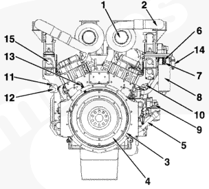 1渦輪增壓器排氣接頭,2 ATA 跨接接頭,3組合式機油濾清器,4中冷器殼/進氣歧管,5曲軸箱通風裝置,6風扇皮帶惰輪總成,7風扇輪轂,8燃油濾清器,9冷卻液添加劑,10進氣歧管壓力傳感器 2(右排),11進氣歧管壓力傳感器 1(左排),12冷卻液進口接頭,13充電機,14燃油進口管接頭,15減振器。