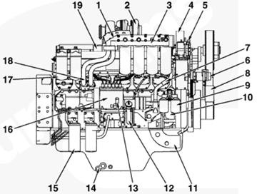 1空氣跨接殼體,2渦輪增壓器,3全流式機油濾清器,4出水口接頭,5吊耳,6風扇皮帶惰輪總成,7水旁通管,8風扇皮帶惰輪皮帶輪,9水濾器,10水泵,11進水口接頭,12機油加注管,13輸油泵,14放油口,15燃油濾清器,16燃油泵,17機油旁通濾清器,18機油輸送管,19進氣歧管。