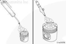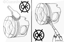 不要使用金屬刷。金屬刷會損壞活塞環(huán)槽。不要用玻璃噴丸清潔活塞環(huán)槽。可使用零件號為3822735的胡桃殼或塑料噴丸對活塞環(huán)槽和活塞頂進(jìn)行噴丸處理。用最小的有效壓力,并且不要長時間集中噴射一個區(qū)域。塑料噴丸的推薦工作壓力是276 kPa [40 psi]。
