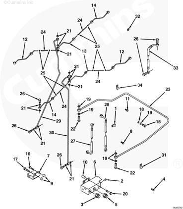 1左排歧管(零件號 3094772),2流至 EHAB 進(jìn)口(左排供油)的燃油(抽吸未經(jīng)過濾的燃油),3流至右排燃油歧管(右排供油)的燃油(抽吸未經(jīng)過濾的燃油),4自油箱/粗濾器的供油(抽吸未經(jīng)過濾的燃油),5自右排燃油歧管(右排回油)流入的燃油,6流至供油箱的燃油(回油),7自左排 EHAB/噴油泵溢流管和噴油器回油管(兩條管路)的回油。