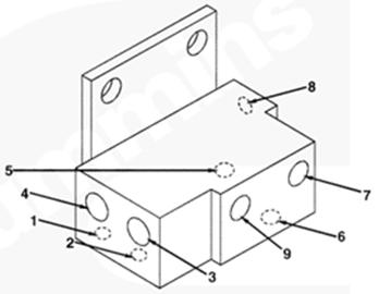 1右排歧管(零件號 3094906),2流至 EHAB 進(jìn)口的燃油(抽吸未經(jīng)過濾的燃油),3自右排噴油器回油管和噴油泵溢流管/EHAB(兩條管路)的回油,4自左排燃油歧管(右排供油)的燃油(抽吸未經(jīng)過濾的燃油),5流至左排燃油歧管(自右排回油)的燃油,6自濾清器和左排燃油歧管的燃油(經(jīng)過濾的增壓燃油),7流至左排燃油歧管(未經(jīng)過濾的增壓燃油)和濾清器的燃油,8自輸油泵的燃油(未經(jīng)過濾的增壓燃油),9流至噴油泵進(jìn)口/EHAB 的燃油(經(jīng)過濾的增壓燃油)。