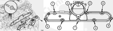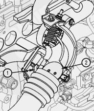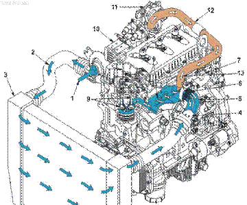 1至渦輪增壓器進氣口, 2至空空中冷器的增壓后空氣,3空空中冷器,4節氣門執行器,5進氣管接頭,6進氣加熱器,7進氣歧管,8缸蓋進氣口,9進氣門,10EGR 冷卻器,11EGR 閥,12EGR 跨接管,13至進氣歧管的排氣,